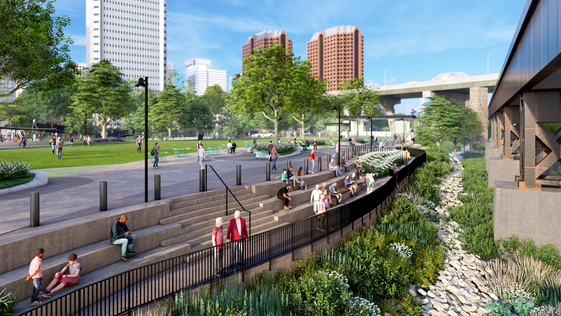 The project builds on years of planning for Richmond’s riverfront and introduces a series of distinct zones—from the Great Lawn and River Terraces to Haxall Gardens and new gathering spaces—designed to support both everyday use and large-scale events.