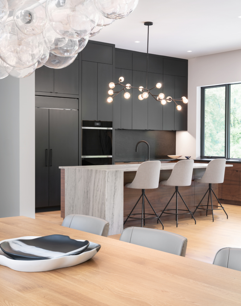 Situated at the intersection of two established neighborhoods—one a traditional grid and the other a rolling landscape of diverse architectural styles—the home strikes a deliberate balance between openness and privacy. Expansive windows and carefully framed views blur the line between indoors and out, while crisp, low-maintenance, and sustainable materials lend the home both durability and warmth. Rendered in wood, metal, and stone, each surface was chosen for its ability to complement and contrast—light with dark, smooth with coarse, rustic with refined—creating a rich yet calming atmosphere.